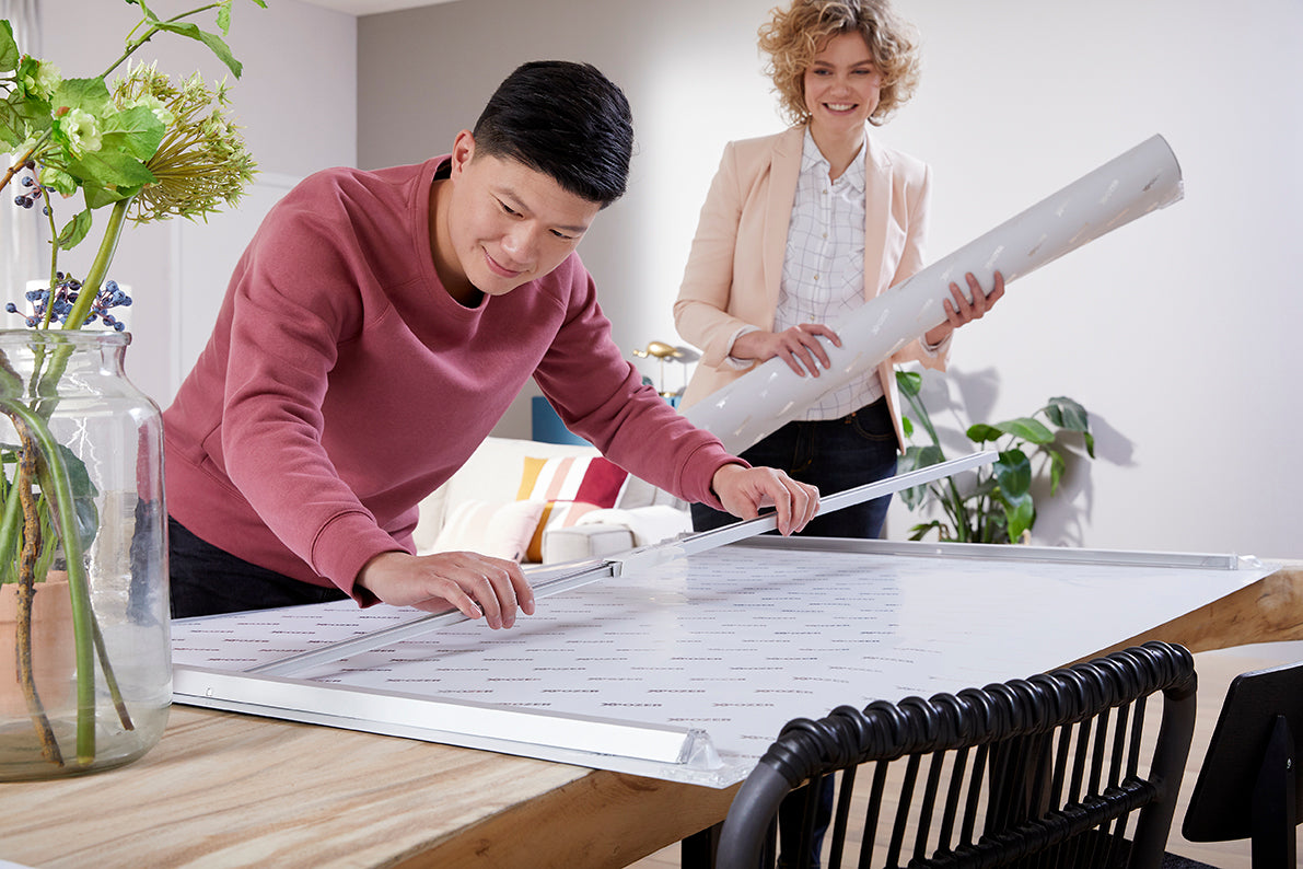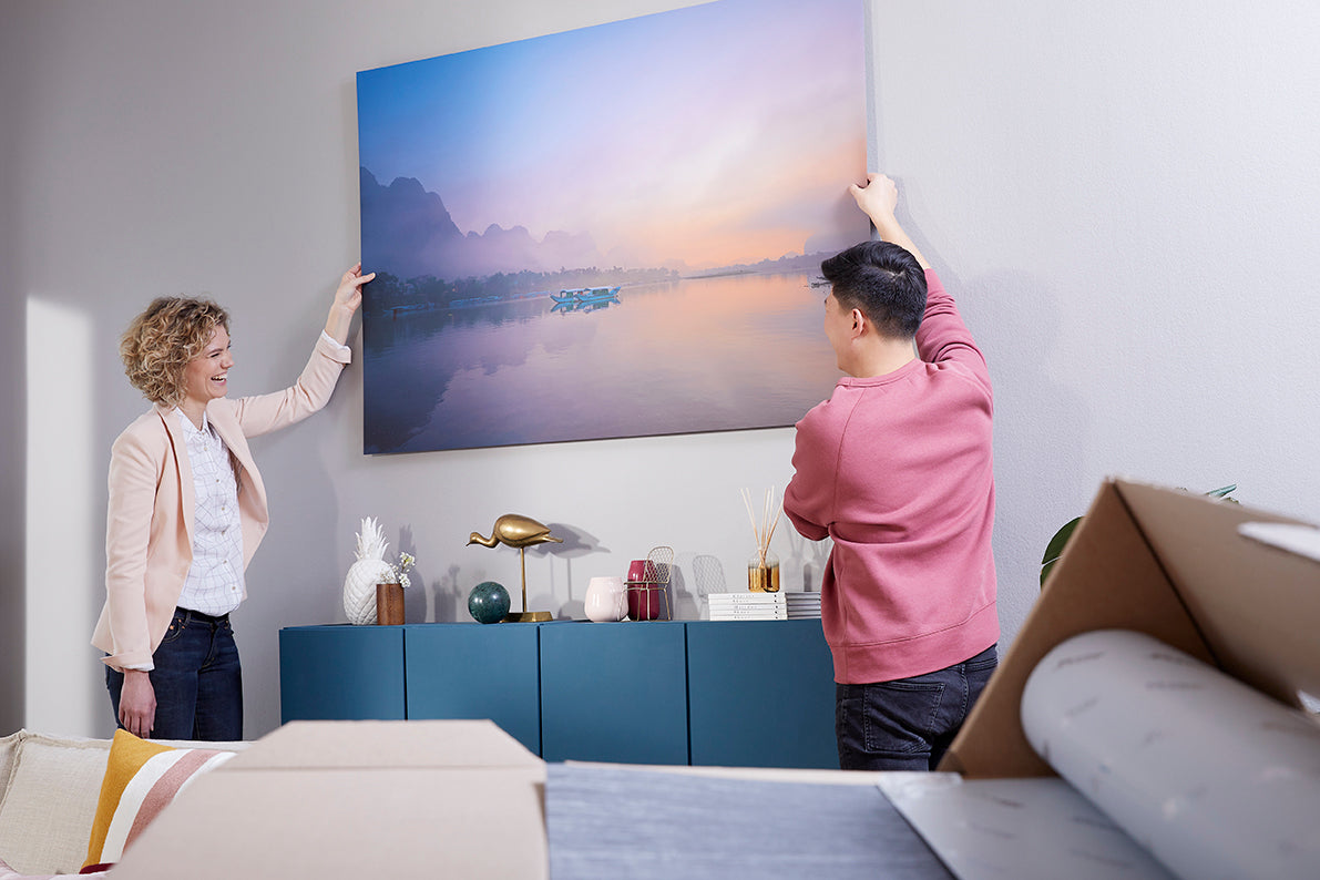 The patented tension system creates a perfectly flat, borderless print that floats elegantly off the wall.